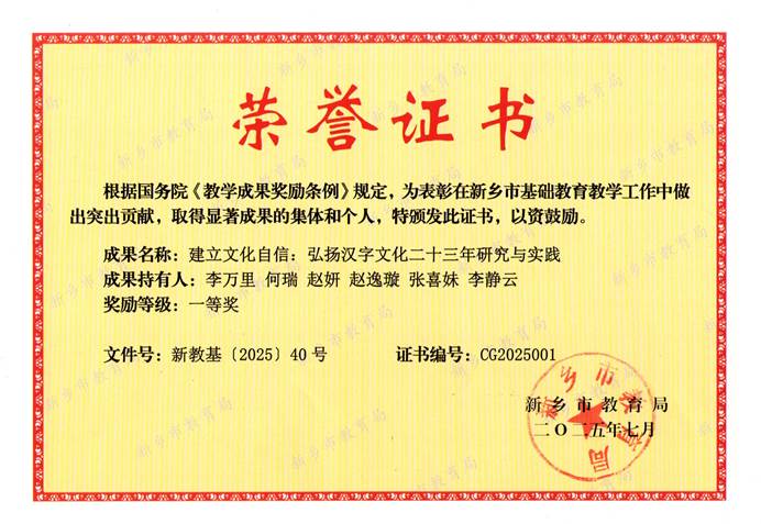 李万里主持研究成果《建立文化自信:弘扬汉字文化二十三年级研究与实践》,获新乡市基础教育教学成果一等奖。2025年7月。(文件号:新教基〔2025〕40号;证书编号:CG2025001)